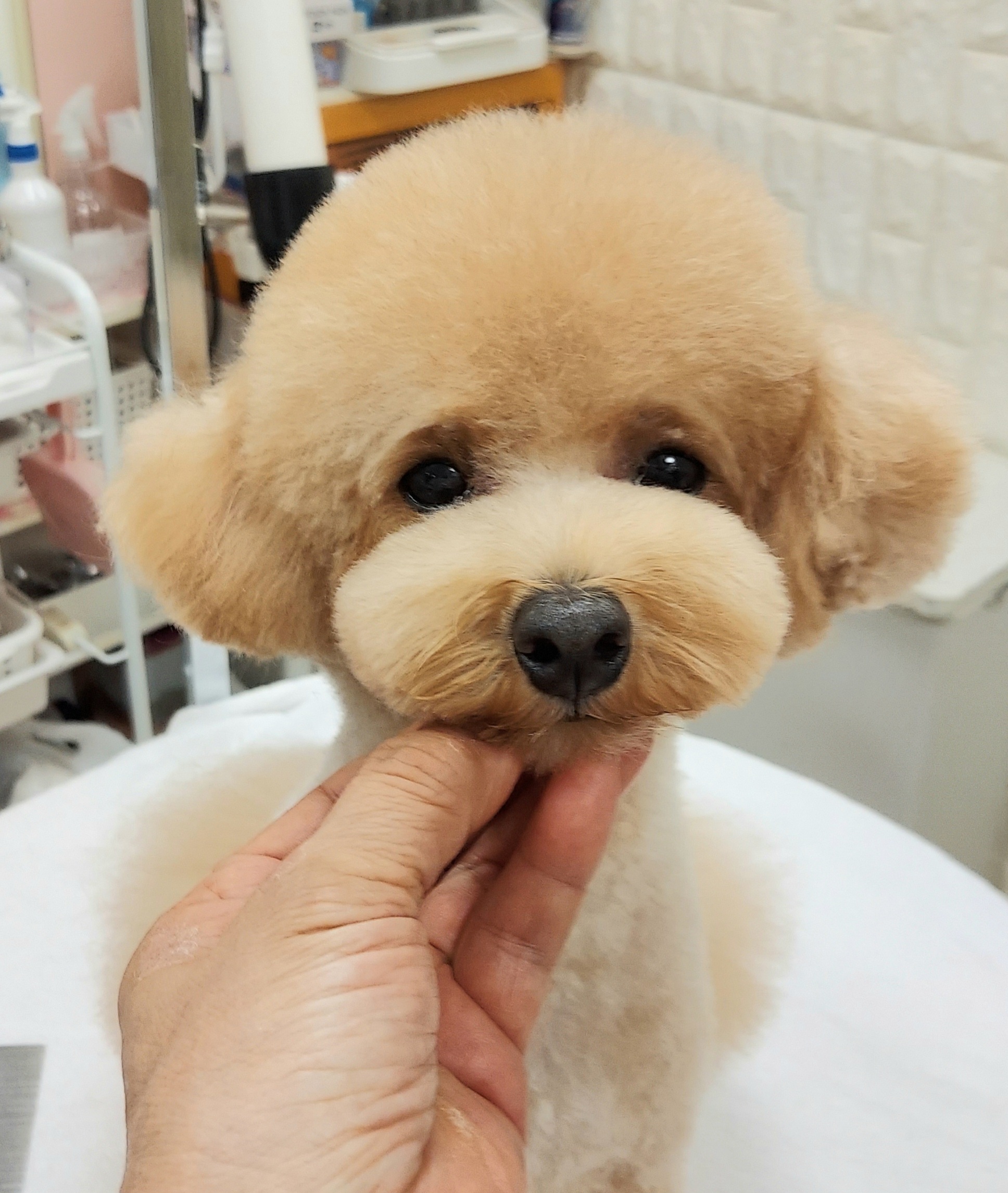 お耳を動かした時も可愛く見えるように、耳の毛のカットを工夫しました。お尻はスカートカットでゴージャスに。 -