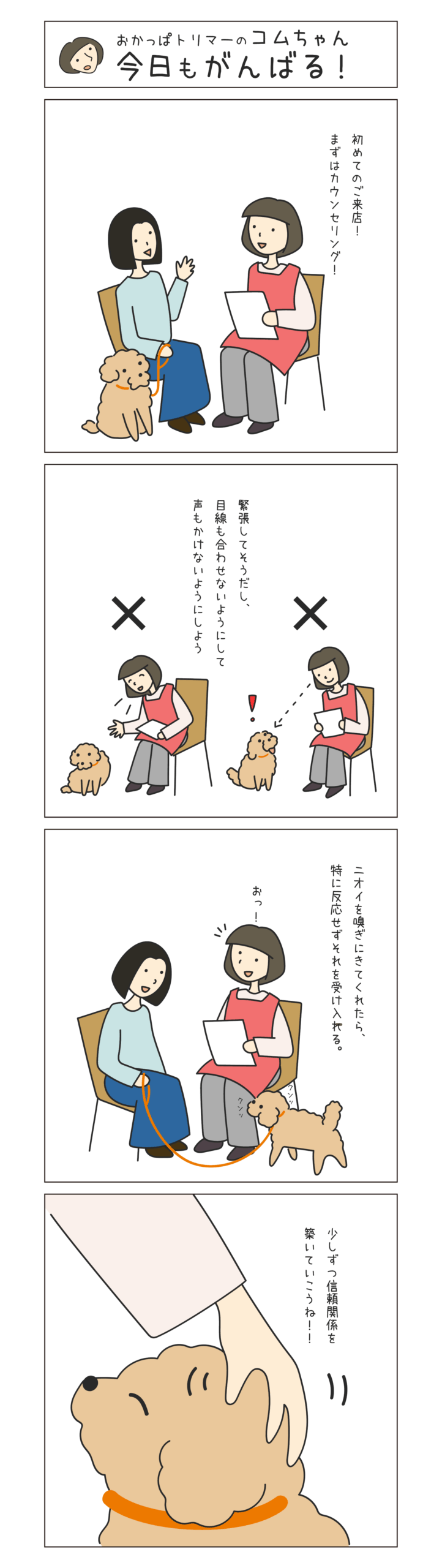 おかっぱトリマーのコムちゃん4コマシリーズ「信頼関係は焦らずに」 2025 10/27 トリマーどっとこむブログ 2025年10月27日 トリマーどっとこむ トリマーどっとこむブログ シェアして多くの方に届けよう! URLをコピーしました! カットのオーダーのコツ!「思ってたのと違う」を防ぐ方法 トリマーのSNS運用|NG投稿と好感度UPする発信例 \掲載希望のトリマー様向け/ 1分で簡単登録 この記事を書いたトリマー トリマーどっとこむ トリマーどっとこむの管理者です。 飼い主さんが愛犬との暮らしをより豊かにするための お役立ち情報を発信しています^^ このトリマーのお店情報を見る 他の投稿を読む 個人トリマーでもできる!インスタで予約が入る投稿のコツ おかっぱトリマーのコムちゃんの4コマシリーズ「やってきました換毛」 トリマーのSNS運用|NG投稿と好感度UPする発信例 カットのオーダーのコツ!「思ってたのと違う」を防ぐ方法 ドライヤーの種類と違い、選び方まとめ トリミング中に起きたヒヤリ体験とその対処法まとめ おかっぱトリマーのコムちゃん4コマシリーズ「記念すべき1stトリミング」 カットの仕上がりが変わる!ハサミの選び方と使い分け