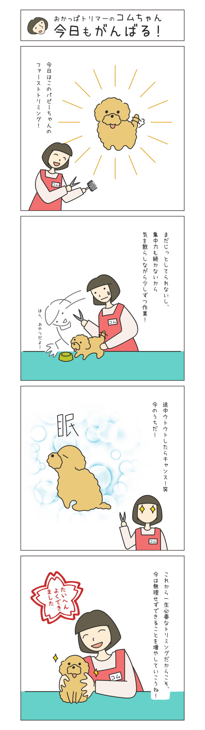 おかっぱトリマーのコムちゃん4コマシリーズ「記念すべき1stトリミング」 2025 10/06 トリマーどっとこむブログ 2025年10月14日 トリマーどっとこむ トリマーどっとこむブログ シェアして多くの方に届けよう! URLをコピーしました! カットの仕上がりが変わる!ハサミの選び方と使い分け トリミング中に起きたヒヤリ体験とその対処法まとめ \掲載希望のトリマー様向け/ 1分で簡単登録 この記事を書いたトリマー トリマーどっとこむ トリマーどっとこむの管理者です。 飼い主さんが愛犬との暮らしをより豊かにするための お役立ち情報を発信しています^^ このトリマーのお店情報を見る 他の投稿を読む 個人トリマーでもできる!インスタで予約が入る投稿のコツ おかっぱトリマーのコムちゃんの4コマシリーズ「やってきました換毛」 トリマーのSNS運用|NG投稿と好感度UPする発信例 おかっぱトリマーのコムちゃん4コマシリーズ「信頼関係は焦らずに」 カットのオーダーのコツ!「思ってたのと違う」を防ぐ方法 ドライヤーの種類と違い、選び方まとめ トリミング中に起きたヒヤリ体験とその対処法まとめ カットの仕上がりが変わる!ハサミの選び方と使い分け